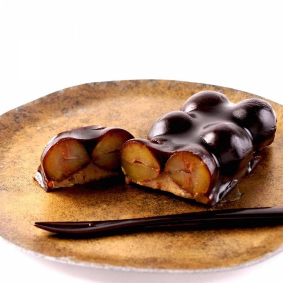 国産の栗餡に栗の渋皮煮を丸ごとのせ、黒糖羊羹で上掛けしました。