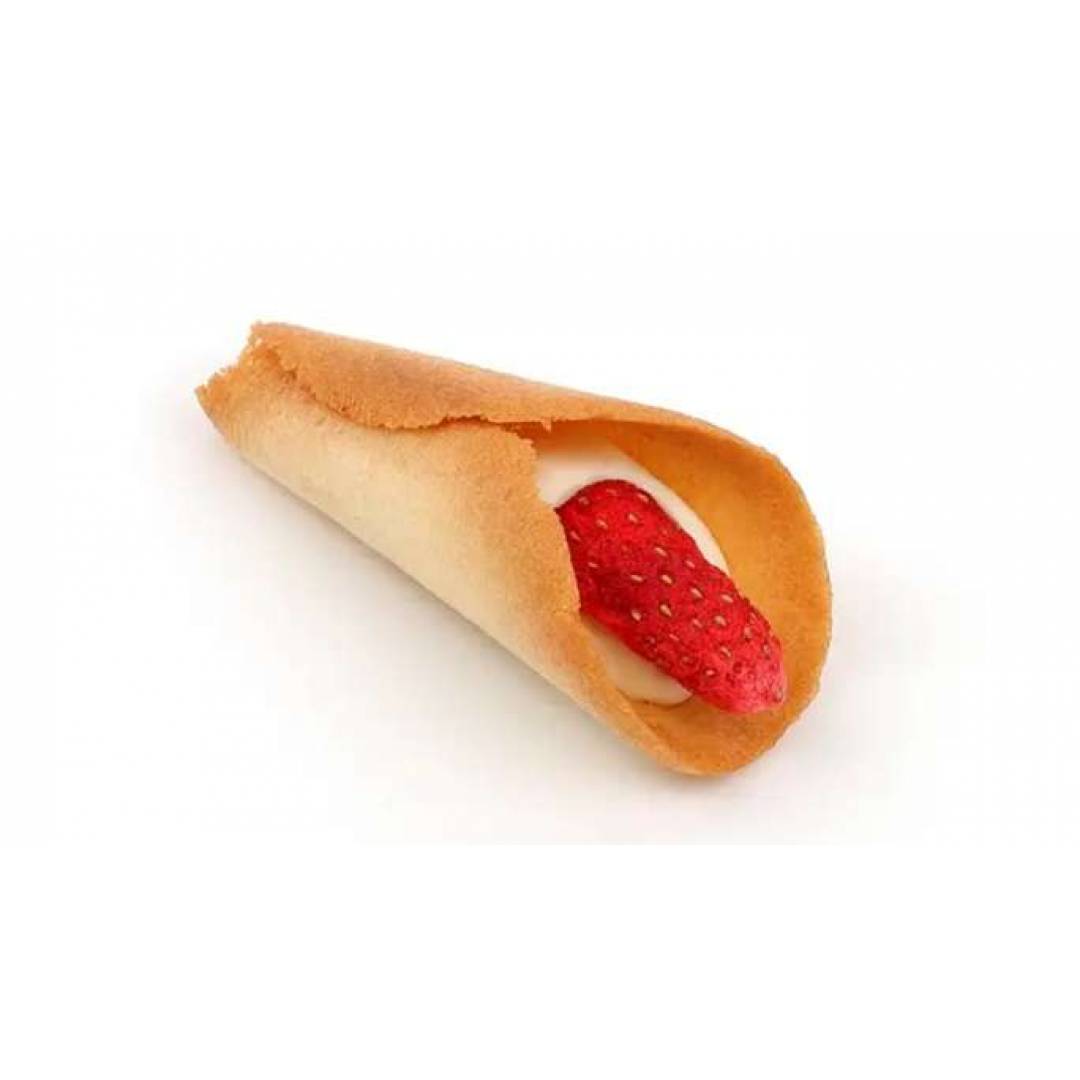 さっくりと焼き上げたラングドシャにホワイトチョコクリームを絞り、フリーズドライの苺をのせました。