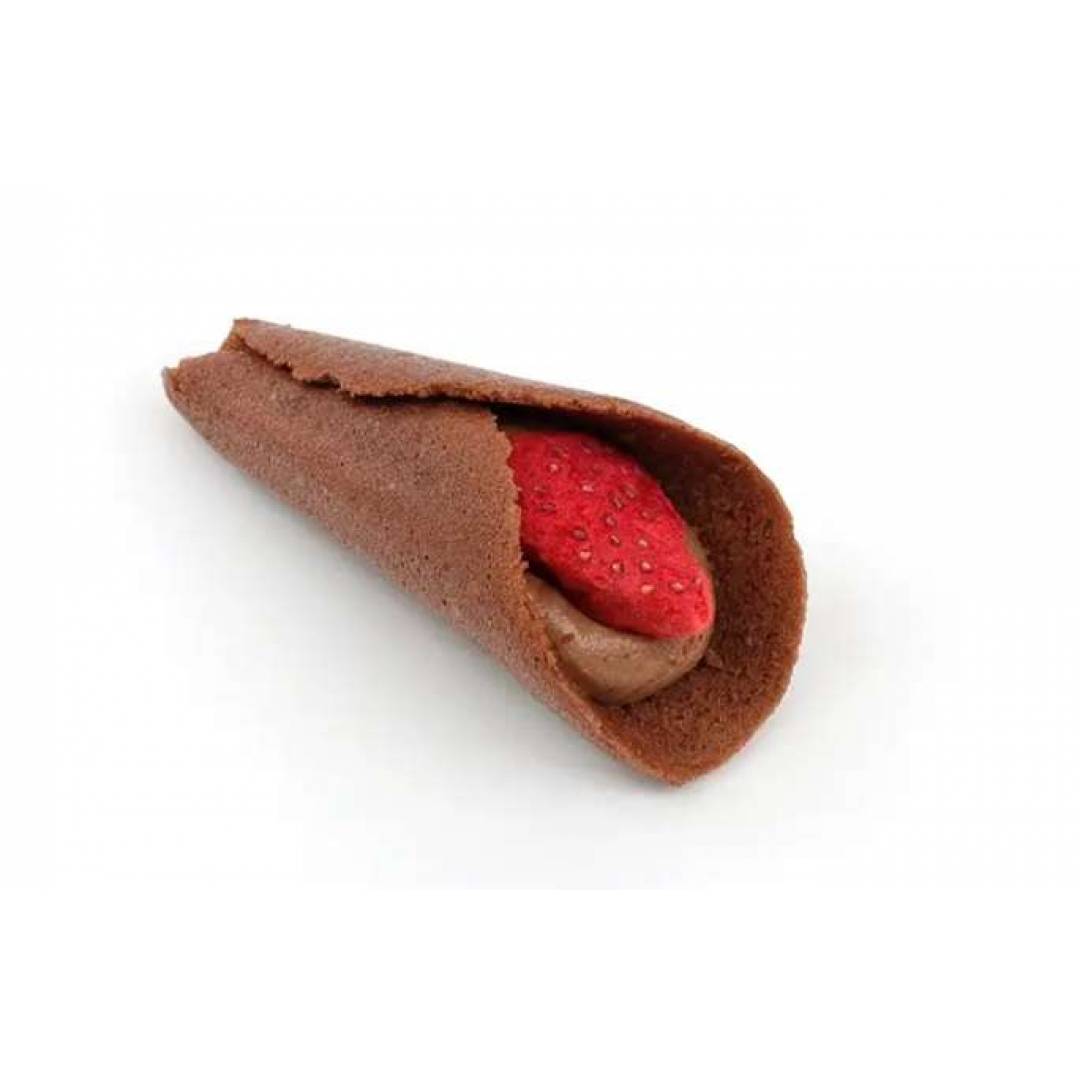 さっくりと焼き上げたココア生地のラングドシャにミルクチョコクリームを絞り、フリーズドライの苺をのせました。