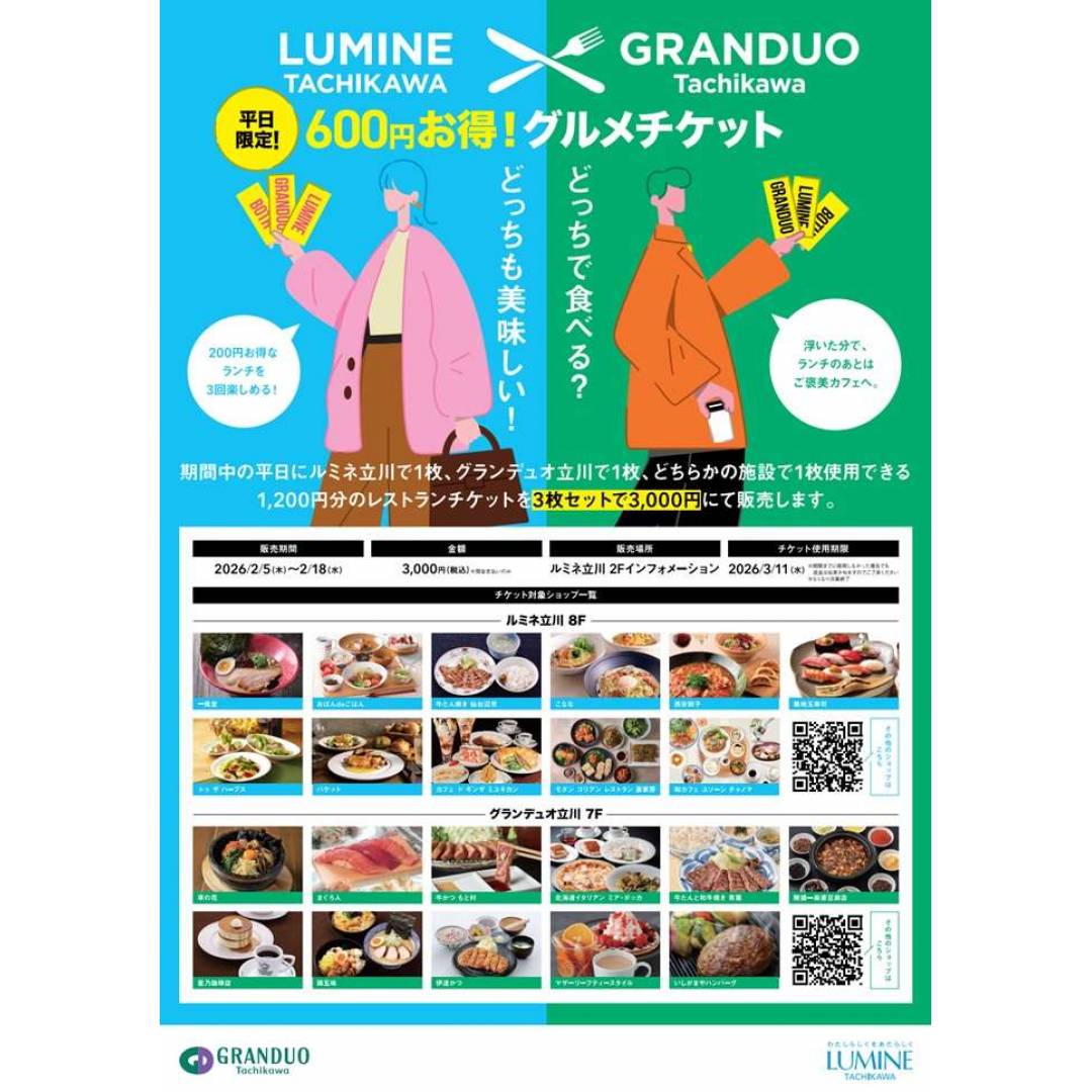 期間中の平日にルミネ立川で1枚、グランデュオ立川で1枚、どちらかの施設で1枚使用できる1,200円分のレストランチケットを3枚セットで3,000円にて販売いたします。